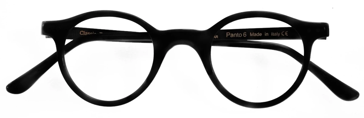 The Panto 6 has a small but deep, classic panto shape (almost round), with a flatter top and rounder bottom. Made with the highest quality Mazzuchelli zyl, this is a superb shape for any prescription, but is also very accomodating to high prescriptions and progressive lenses. Every component is Made in Italy, including the hinges, and it is completely hand made in Italy.